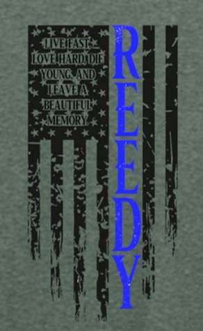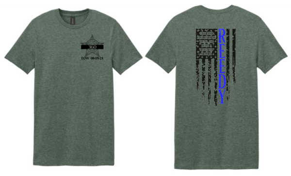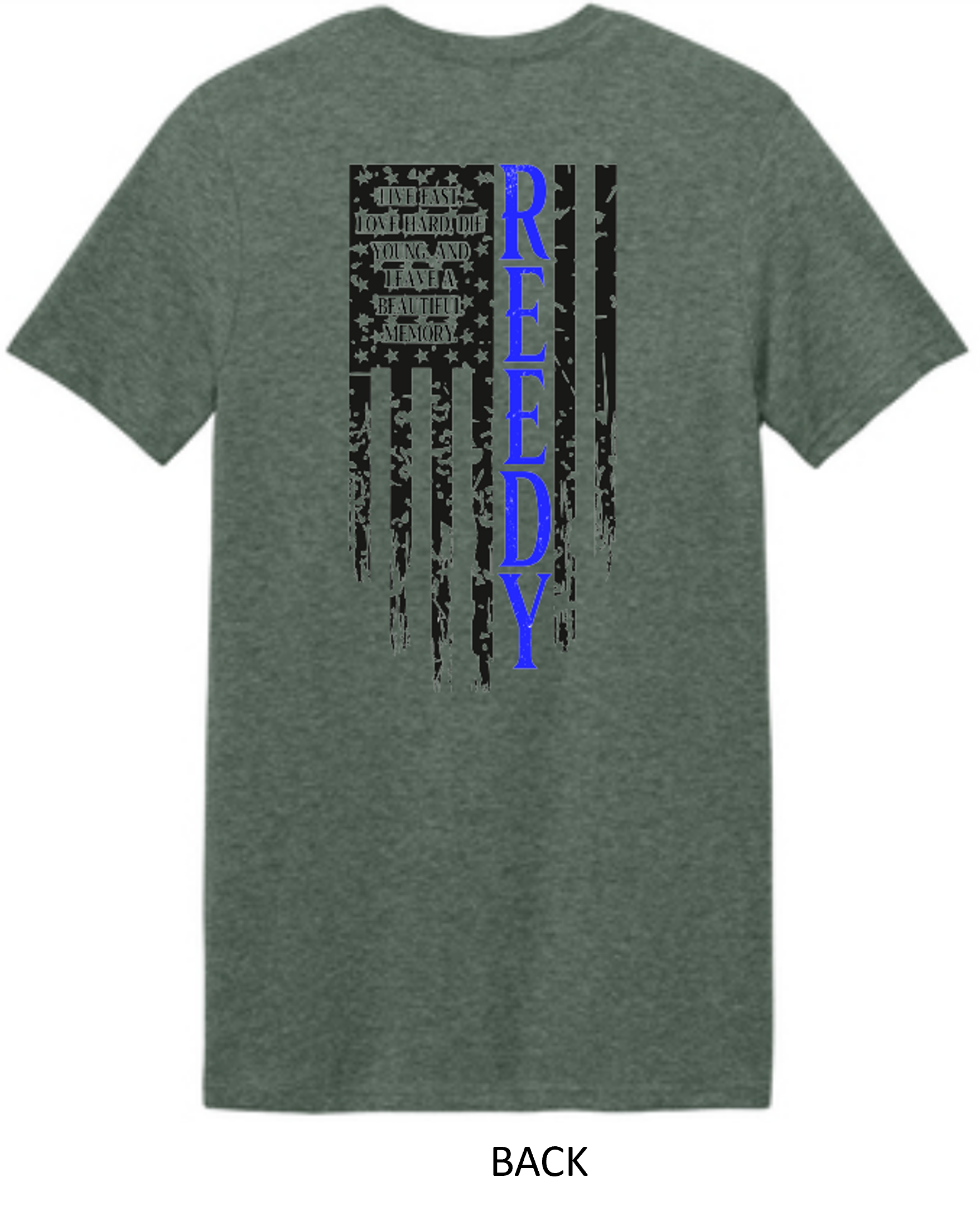 Heather Military Green t-shirt honors Officer Hunter Reedy with a badge on the front and “Live Fast, Love Hard, Die Young, and Leave a Beautiful Memory” alongside “REEDY” on the back, featuring a distressed flag design. T-shirt designed by Travy Delp at Imperial Tattoo.