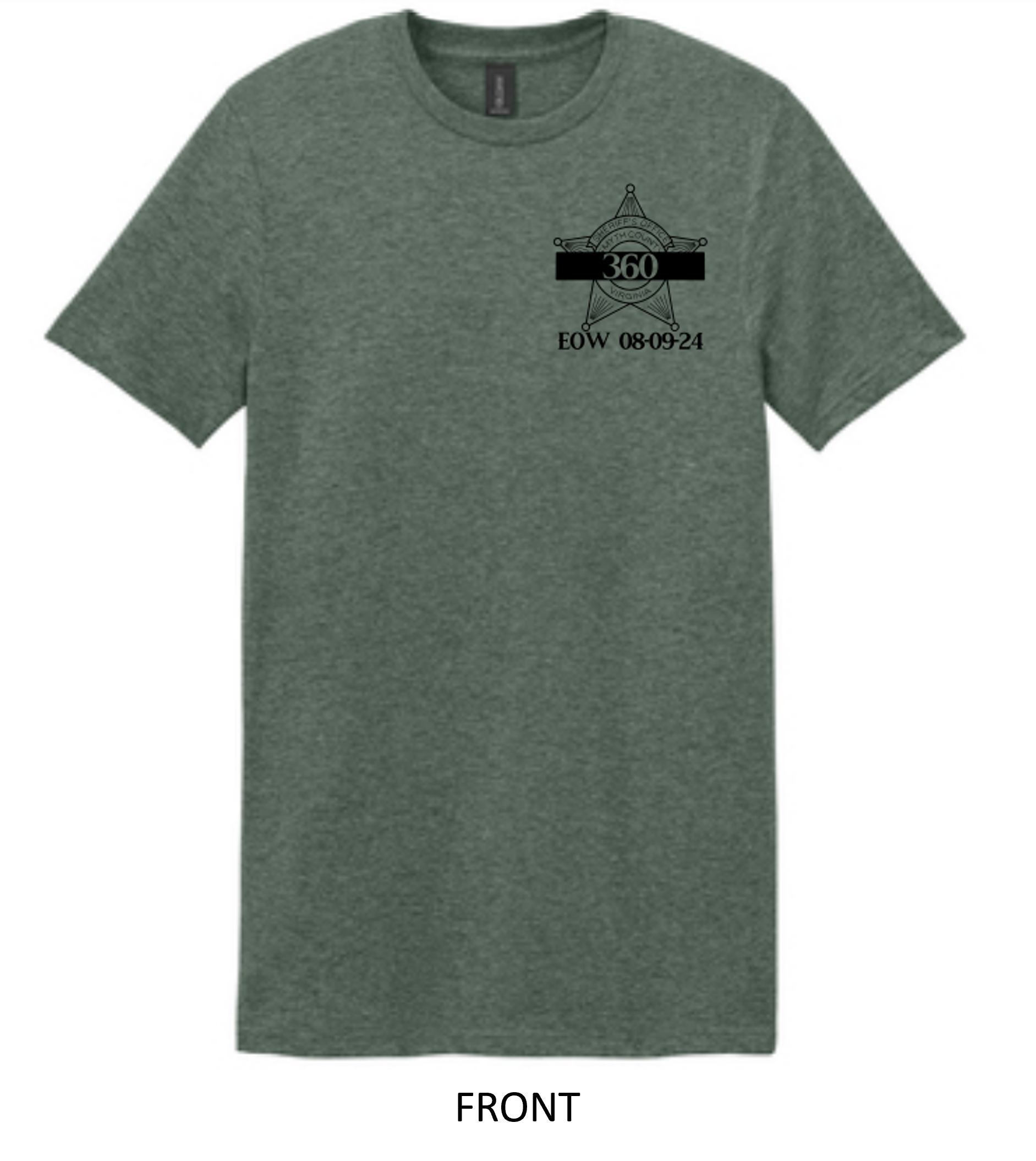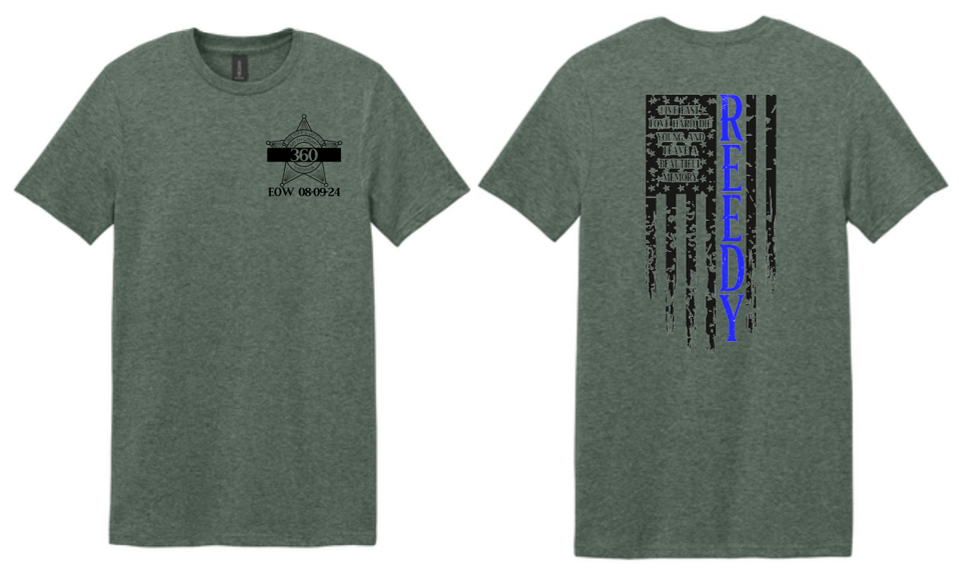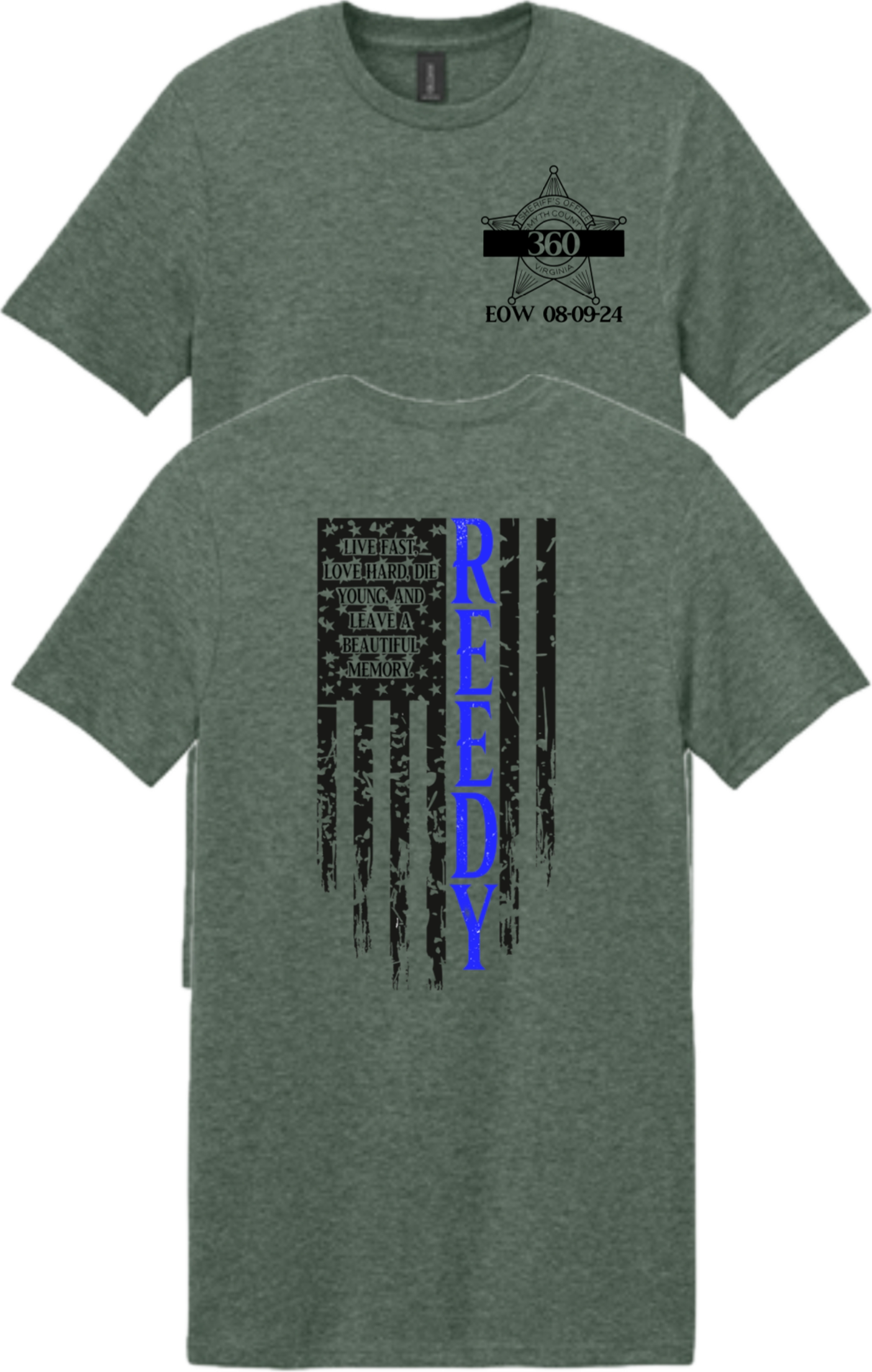 This Heather Military Green t-shirt features a striking design in honor of Officer Hunter Reedy. The front of the shirt displays a Sheriff’s Office Badge with the badge number “360” prominently displayed, accompanied by the end of watch date “EOW 08-09-24.” The back showcases a distressed American flag with a thin blue line, symbolizing law enforcement. Overlaid on the flag is the powerful phrase “Live Fast, Love Hard, Die Young, and Leave a Beautiful Memory,” with the name “REEDY” vertically highlighted in bold blue letters. This commemorative shirt is a meaningful tribute to a fallen hero. Made from a high-quality blend of 65% polyester and 35% cotton, this Gildan Softstyle tee offers unmatched comfort, softness, and durability. With sizes ranging from XS to 4XL, this unisex t-shirt is designed to fit everyone perfectly. T-shirt designed by Travy Delp at Imperial Tattoo